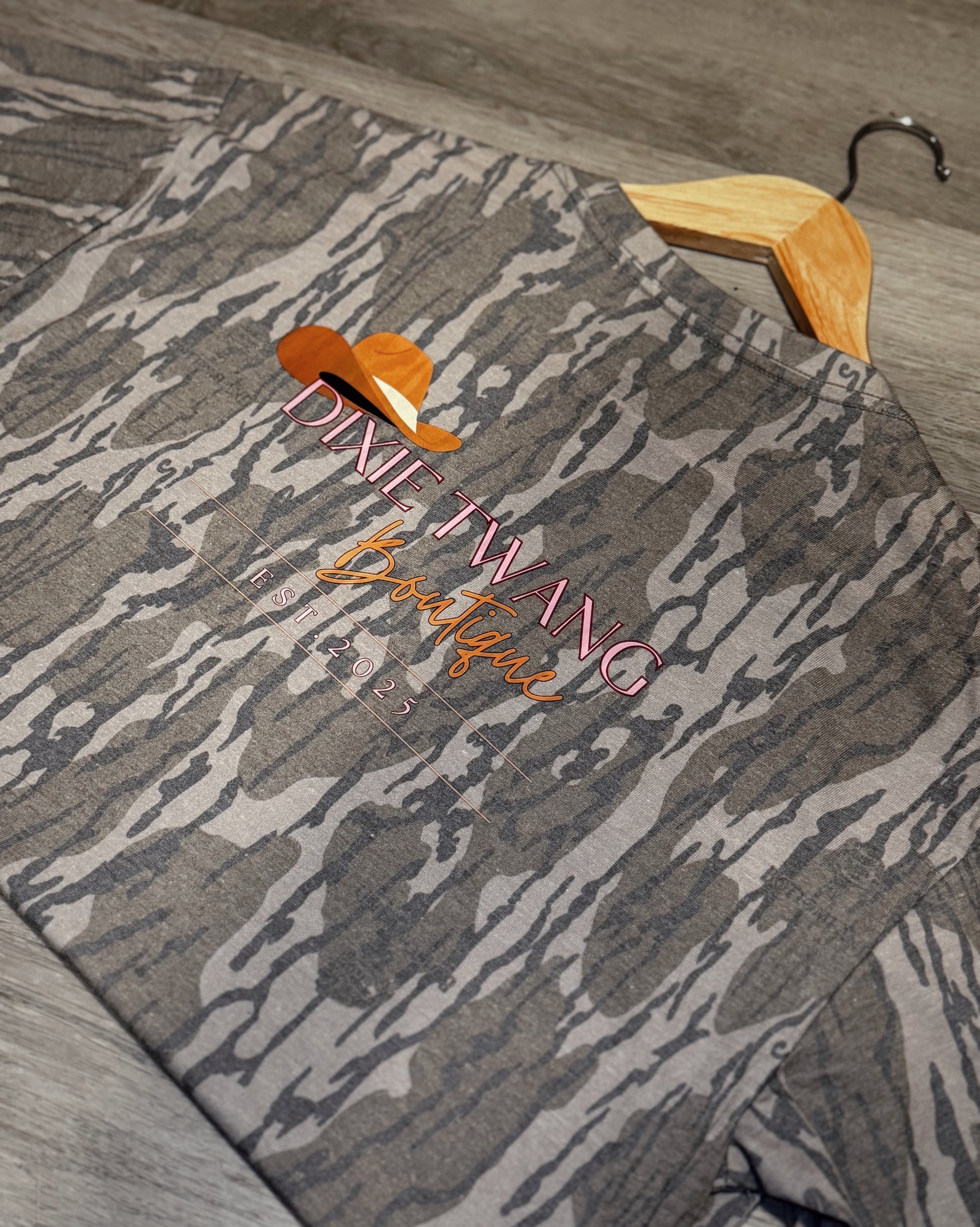 Show off your southern style with our exclusive Dixie Twang Boutique x Mossy Oak Tee, designed with that perfect mix of country charm and cozy comfort! Featuring the Bottomland Camo pattern and our signature logo, this one’s made for all the twang-lovin’ trendsetters.